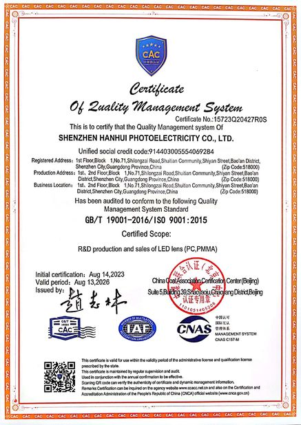 LEDレンズの生産品質をよりよく制御するために,私たちは完全な品質管理システムを確立しました.このシステムは,原材料の調達のすべての側面をカバーします.生産プロセス制御継続的な改善の概念と方法を導入し,従業員に発見を促しました.生産過程で問題を提起し解決するこれらの措置の実施により,私たちは生産プロセスにおける問題を迅速に発見し,解決し,生産効率と製品の質を継続的に向上させることができます.